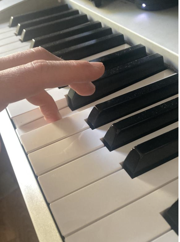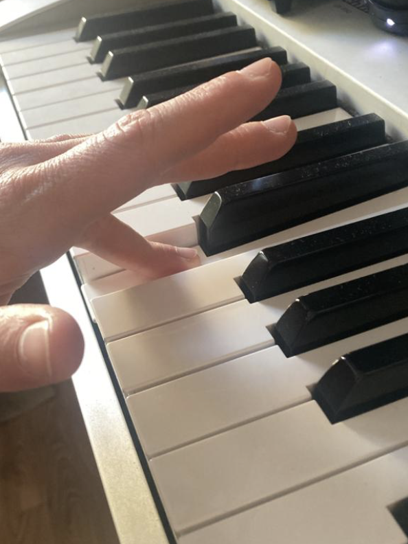 Für die Übung ist es ganz gut, das mal auszuprobieren, wie es ist, wenn der Finger steil auf die Taste gedrückt wird. Langsam geht das immer noch ganz gut abgeknickt, aber wenn es schneller wird, braucht es, dass alle Töne gleich laut klingen, diesen steilen Finger.
